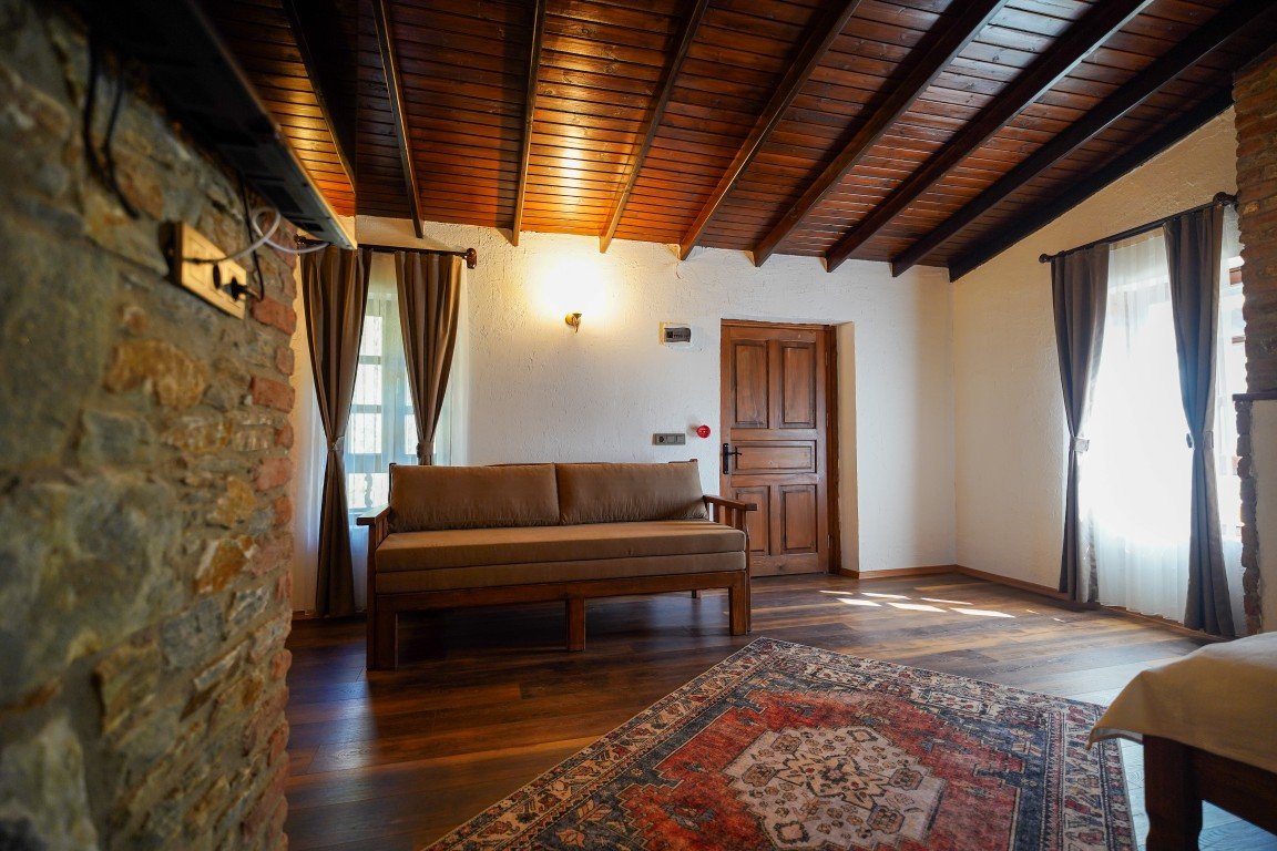 Her odası, köyün tarihinden ilham alınarak özenle tasarlanmıştır. Taş duvarların doğallığı, ahşabın sıcaklığı ve modern detayların inceliğiyle birleşir.