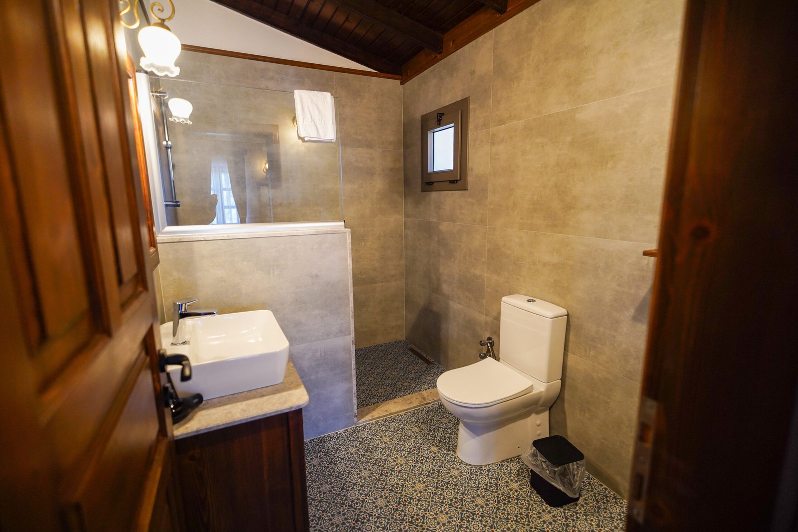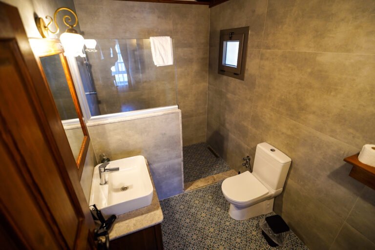 Modern banyo konsepti, özenle seçilmiş detaylar ve Ege’nin ruhunu yansıtan dekorasyonuyla her anında konforu hissedersiniz.